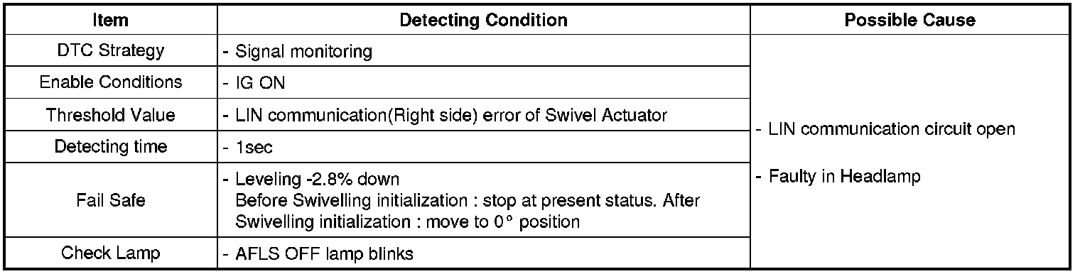 LIN (Local Interconnect Network) is direct communication system to low-cost for electric system of vehicle.height sensor signal, vehicle speed, steering angle sensor signal are input to AFLS ECU to find out of headlamp position and AFLS ECU drive actuators through LIN communication.AFLS (Adaptive Front-Lighting System) drive Leveling Actuator-Intelligent Stepper Motor for adjusting up and down, and Swivel Actuator for adjusting right and left side.
