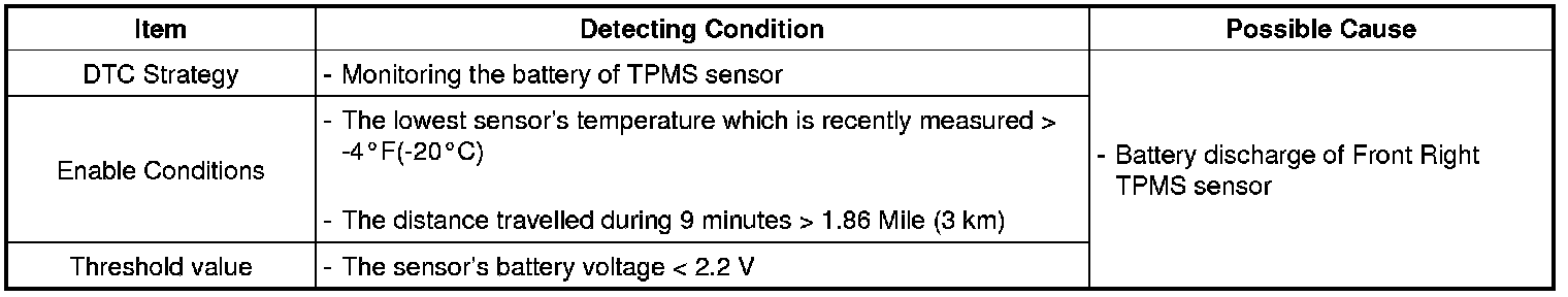 The TPMS ECU monitors the voltage of sensor's battery and if it is below 2.2V, this DTC is set.