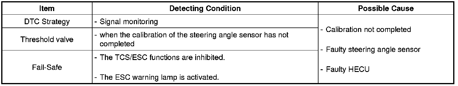The steering angle sensor in the ESC system (it is equally said ESP system) is an absolute angle sensor type. For this reason, the steering angle sensor needs the zero setting (Calibration) by the scantool. If the calibration of this sensor is undone, this DTC is set.