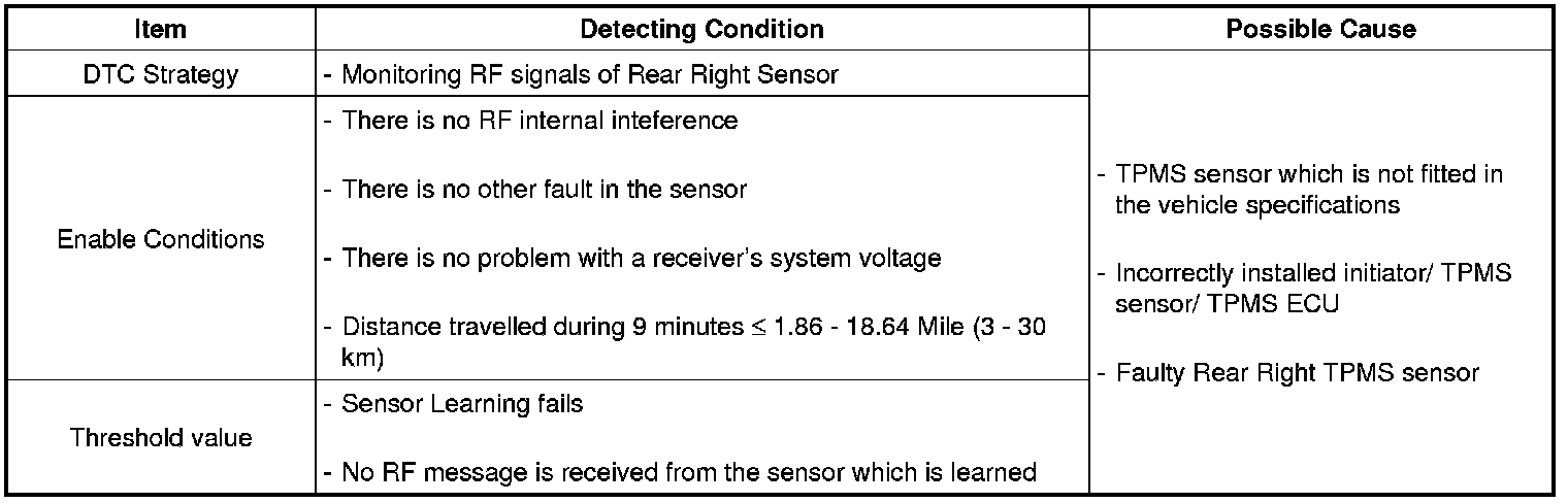 The TPMS ECU monitors the RF signal of the sensor and if it is not received, this DTC is set.