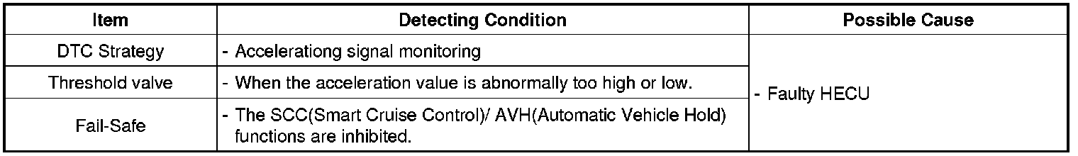 The HECU monitors the acceleration signal and if the signal value is abnormally too high or low, this DTC is set.