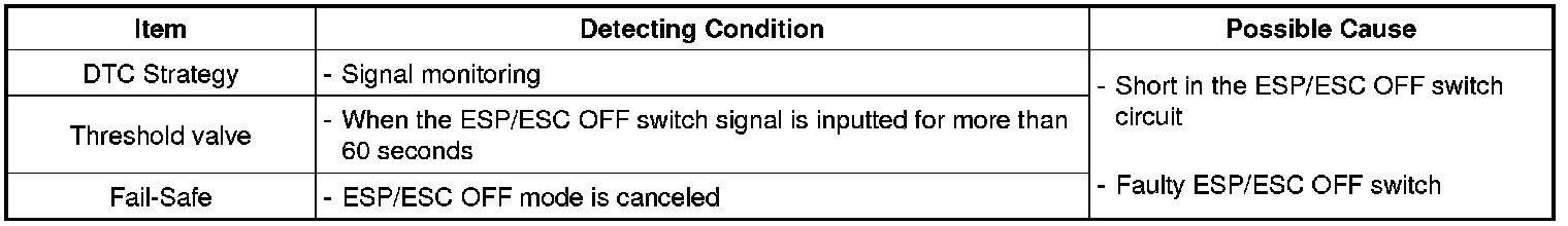 The HECU monitors the ESP/ESC OFF switch signal and if the ESP/ESC OFF switch signal is inputted for more than 1 minute, This DTC is set.