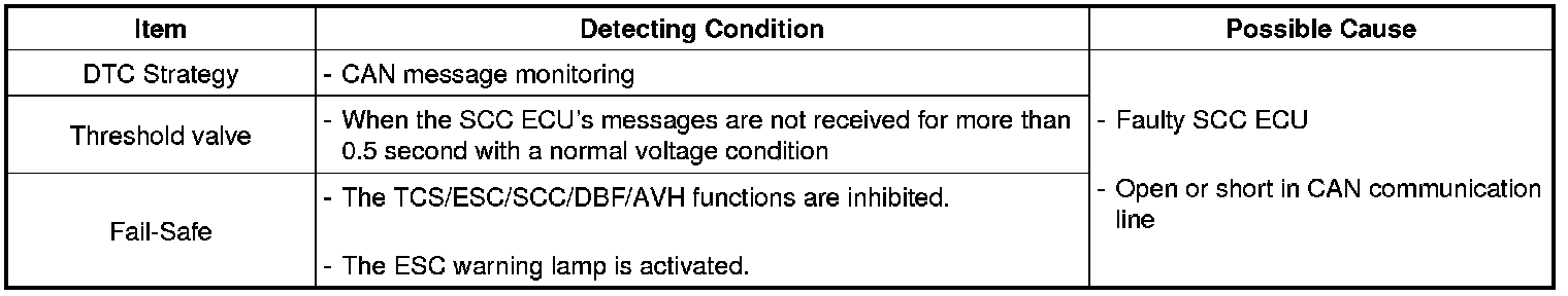 The HECU checks the CAN communication lines for normal control and if a SCC ECU's message is not received for a certain period, this DTC is set.