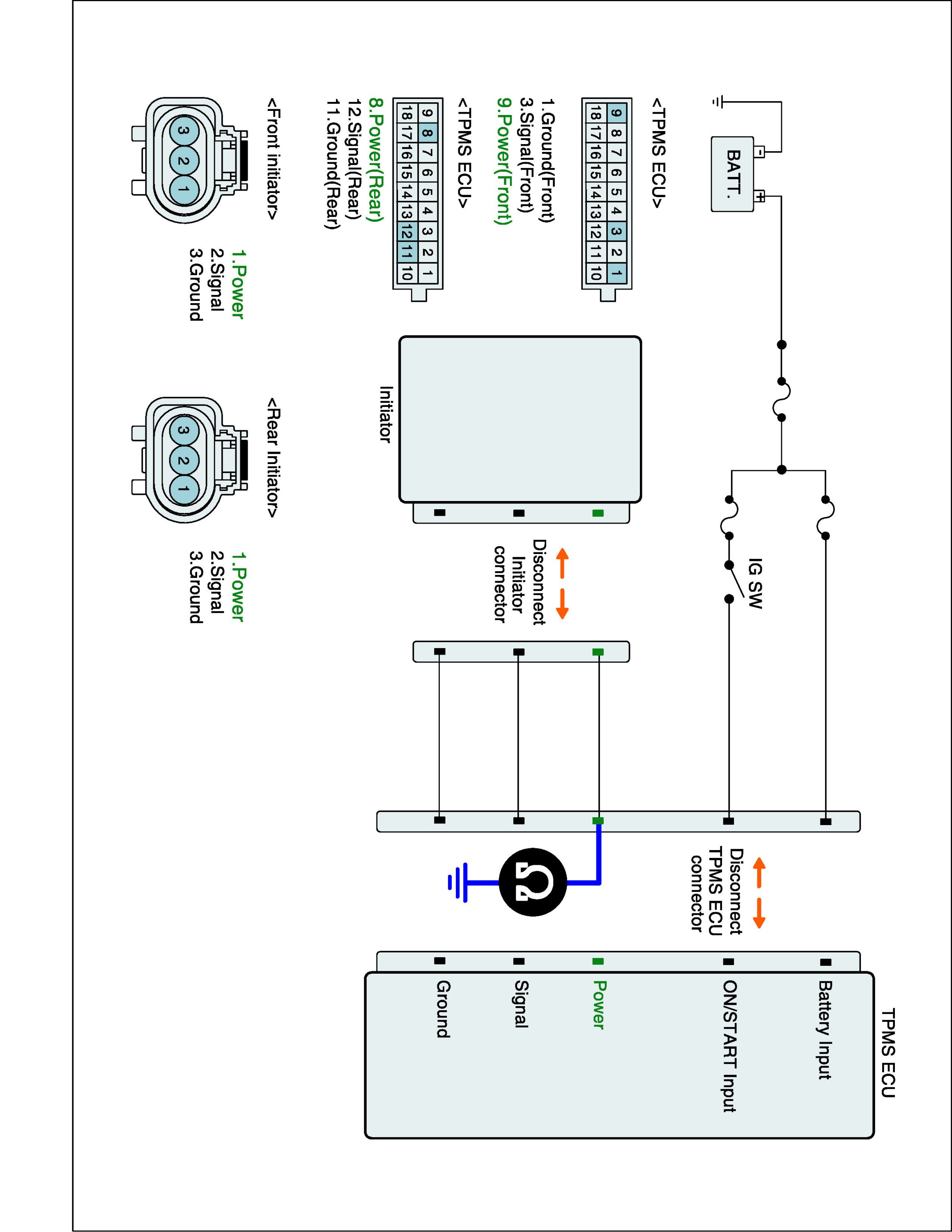 3. Measure resistance between initiator's power terminal of TPMS ECU harness connector and chassis ground.