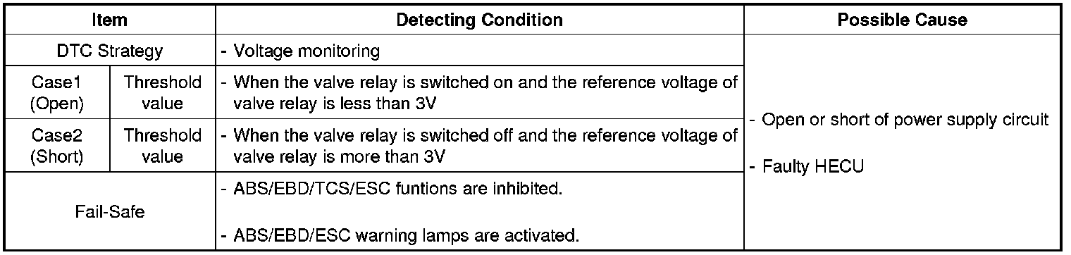 The HECU monitors a voltage of the valve relay for a normal operation and if there is a open or short circuit in the valve relay, this DTC is set.