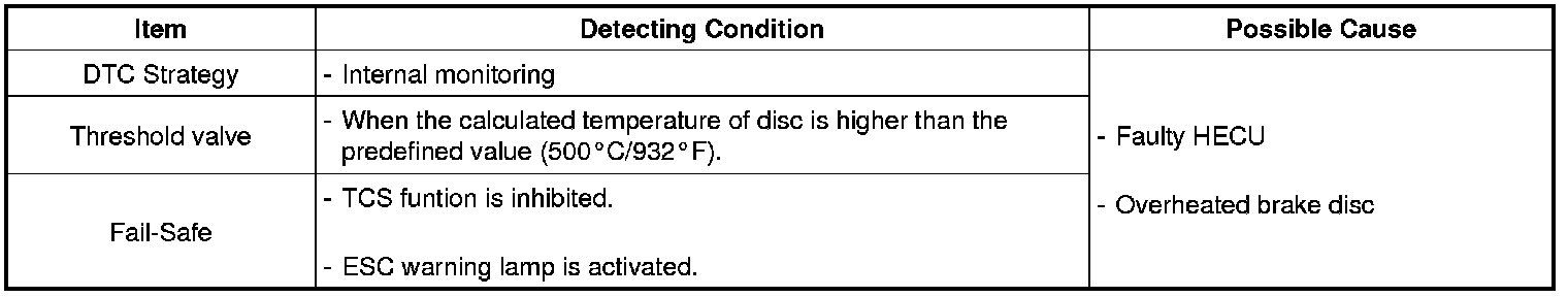 The HECU calculates a disc's temperature for a normal operation and if the calculated disc's temperature is over 500 °C (932 °F), this DTC is set.