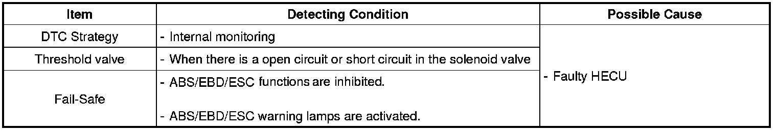 The HECU monitors the solenoid valve circuit for a normal operation and if there is a open or short circuit in the valve, this DTC is set.