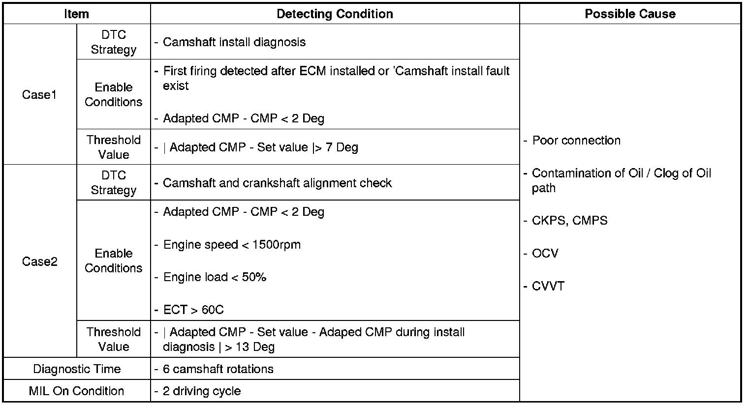 If the deviation between CKPS and CMPS (EX-CMPS Bank 1) is bigger than the threshold value, ECM sets DTC P0017.