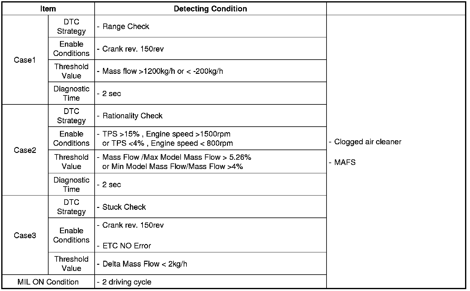 If the deviation between the inlet air mass by MAF signal and the ECM model value is out of the threshold value, ECM sets P0101.