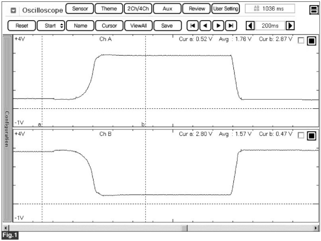 Fig. 1) Normal waveform of TPS1 & TPS2 with no accel pedal depressed under IG ON condition