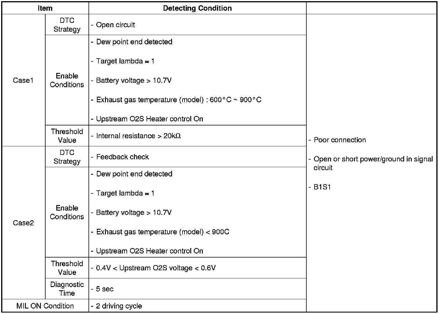 If ECM detects that the output signal satisfies the threshold values under enable conditions, ECM sets DTC P0130.
