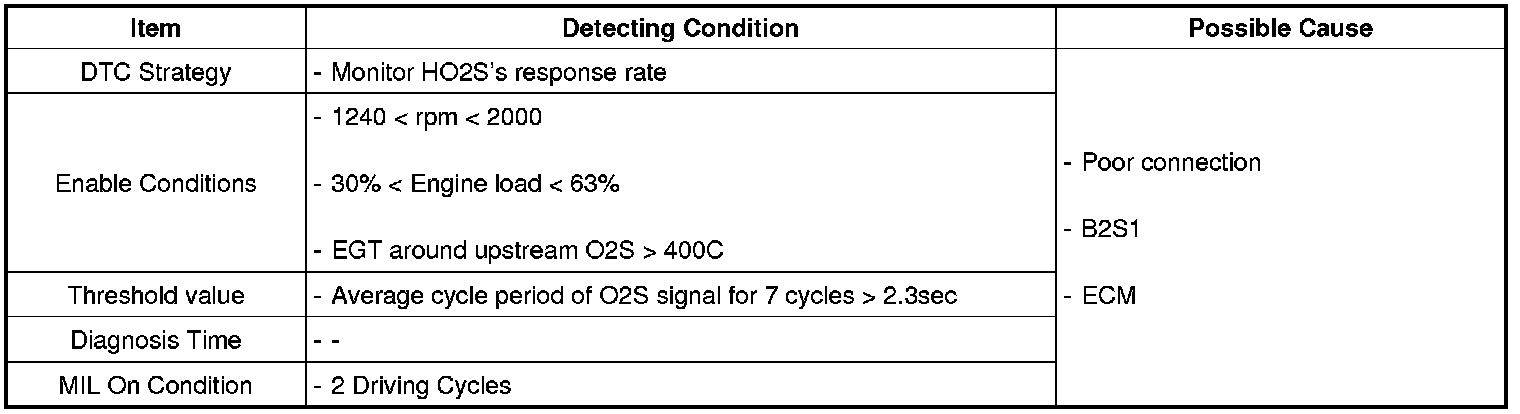 After warming-up, if accelerator pedal is released suddenly around 4000 rpm, the HO2S signal reading will be lower than 200 mV resulting from Fuel cut-off for the moment. Conversely, if suddenly accelerator pedal is depressed, HO2S signal reading will be around 0.6V ~ 1.0V. At idle, Normally HO2S signal will switch from lean to rich with 3 Hz. And as racing, Its frequency rises.