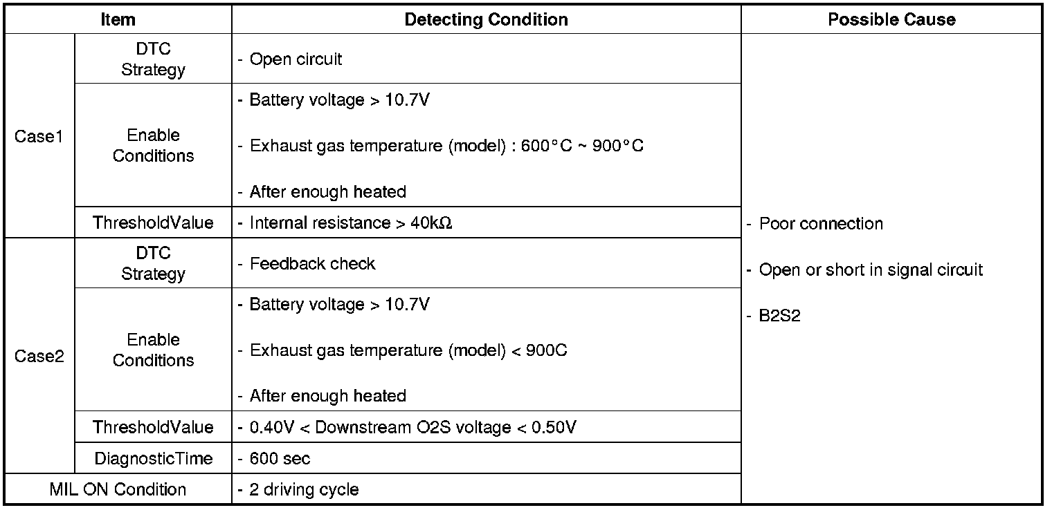 In case the sensor output is 0.4 - 0.52V during 600sec or the internal resistance is over 40 kohms under enable conditions, ECM sets DTC P0156. (This DTC might be caused by the malfunction of Heater circuit, so, check the heater circuit first.)