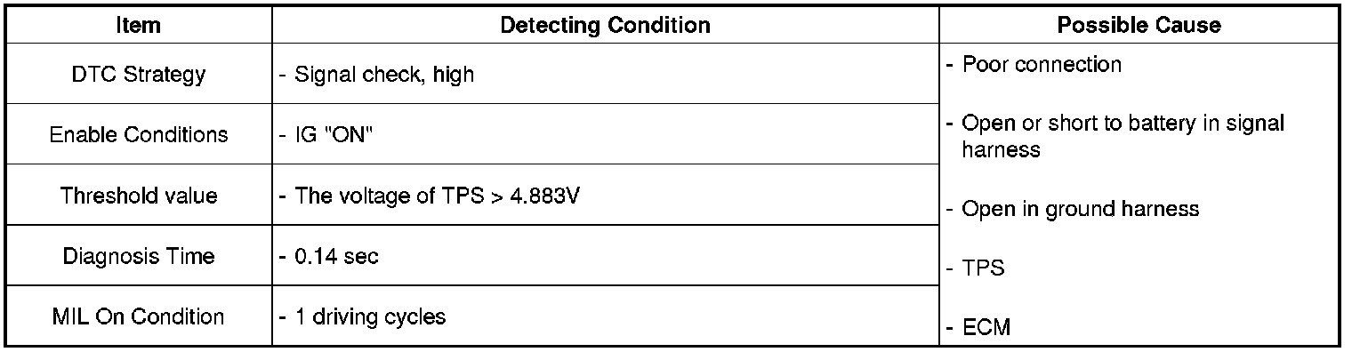 If the sensor input voltage is higher than the maximum threshold value during 0.14 sec under normal driving condition, ECM sets DTC P0223.