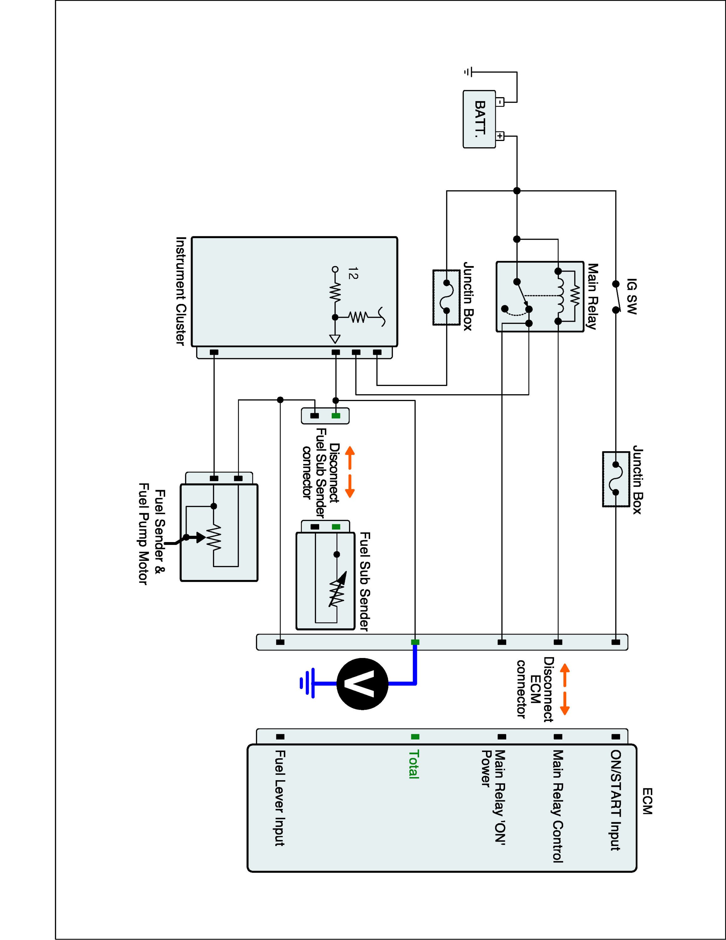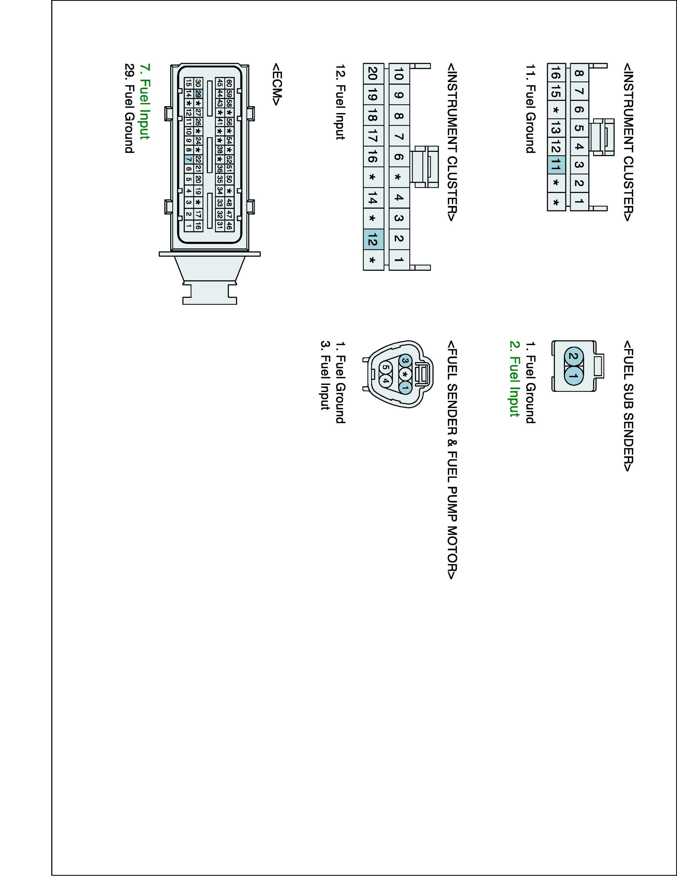 1. IG "OFF" and disconnect Fuel Sub Sender connector and ECM connector.