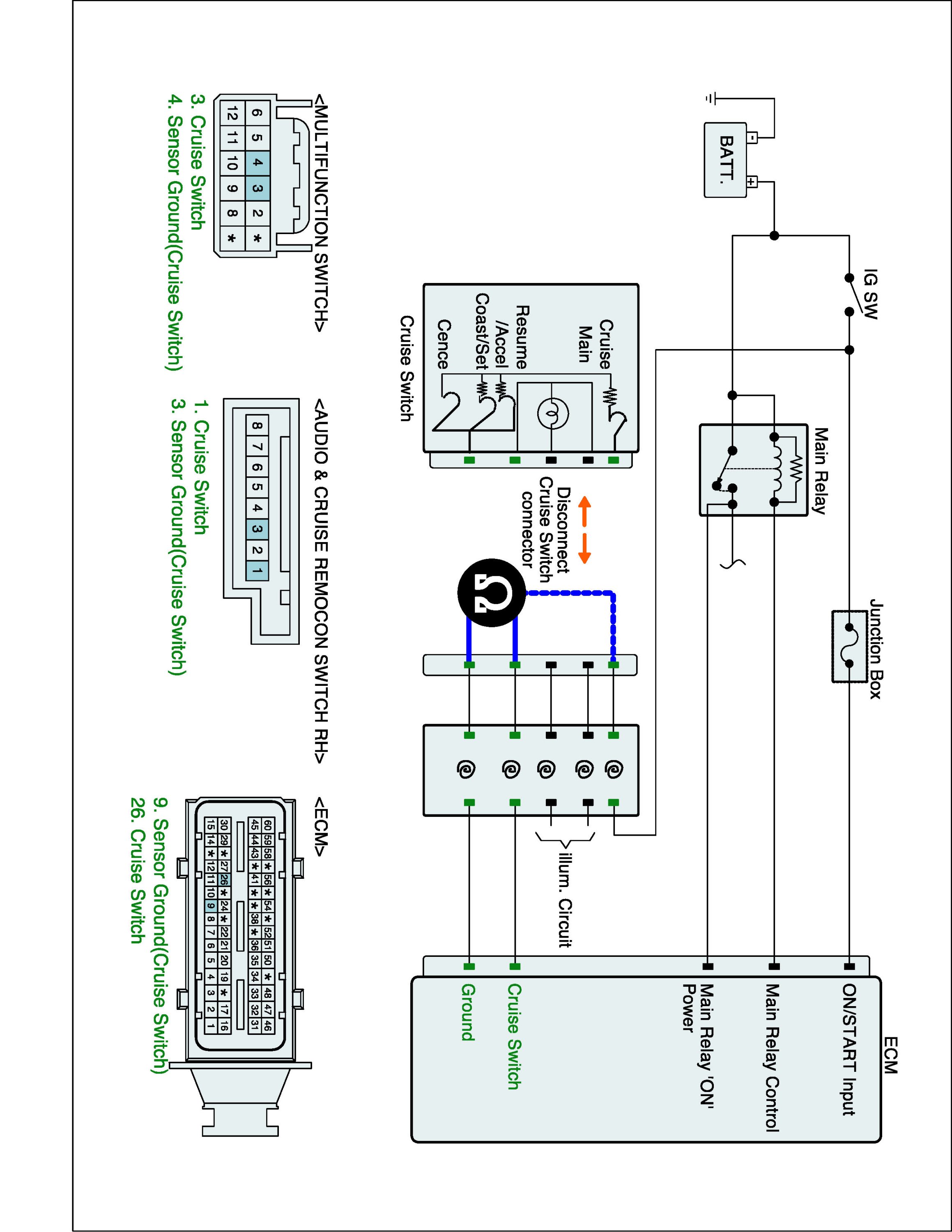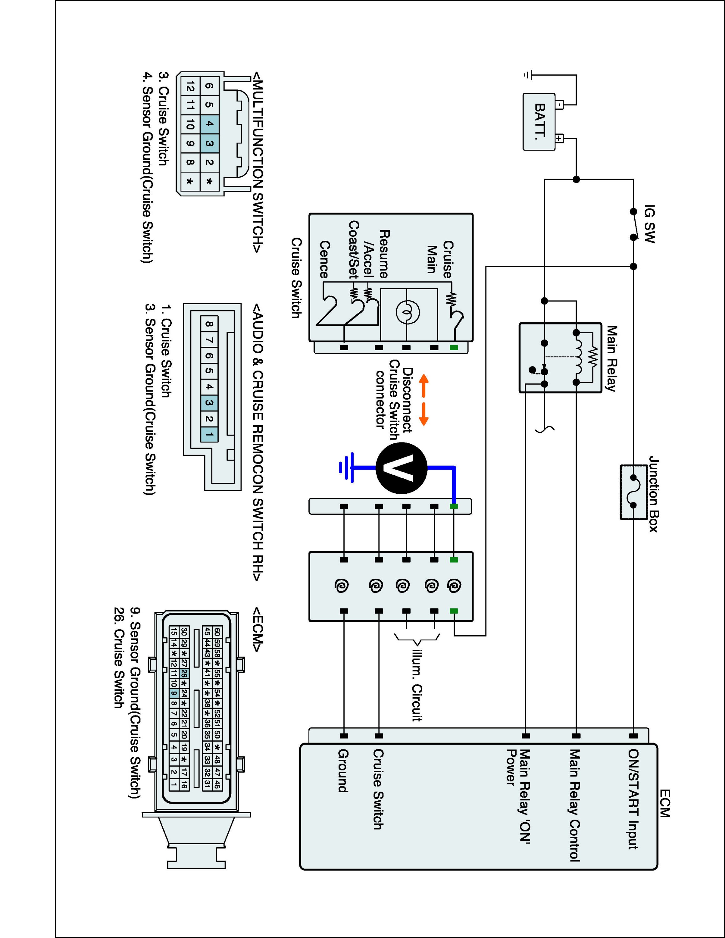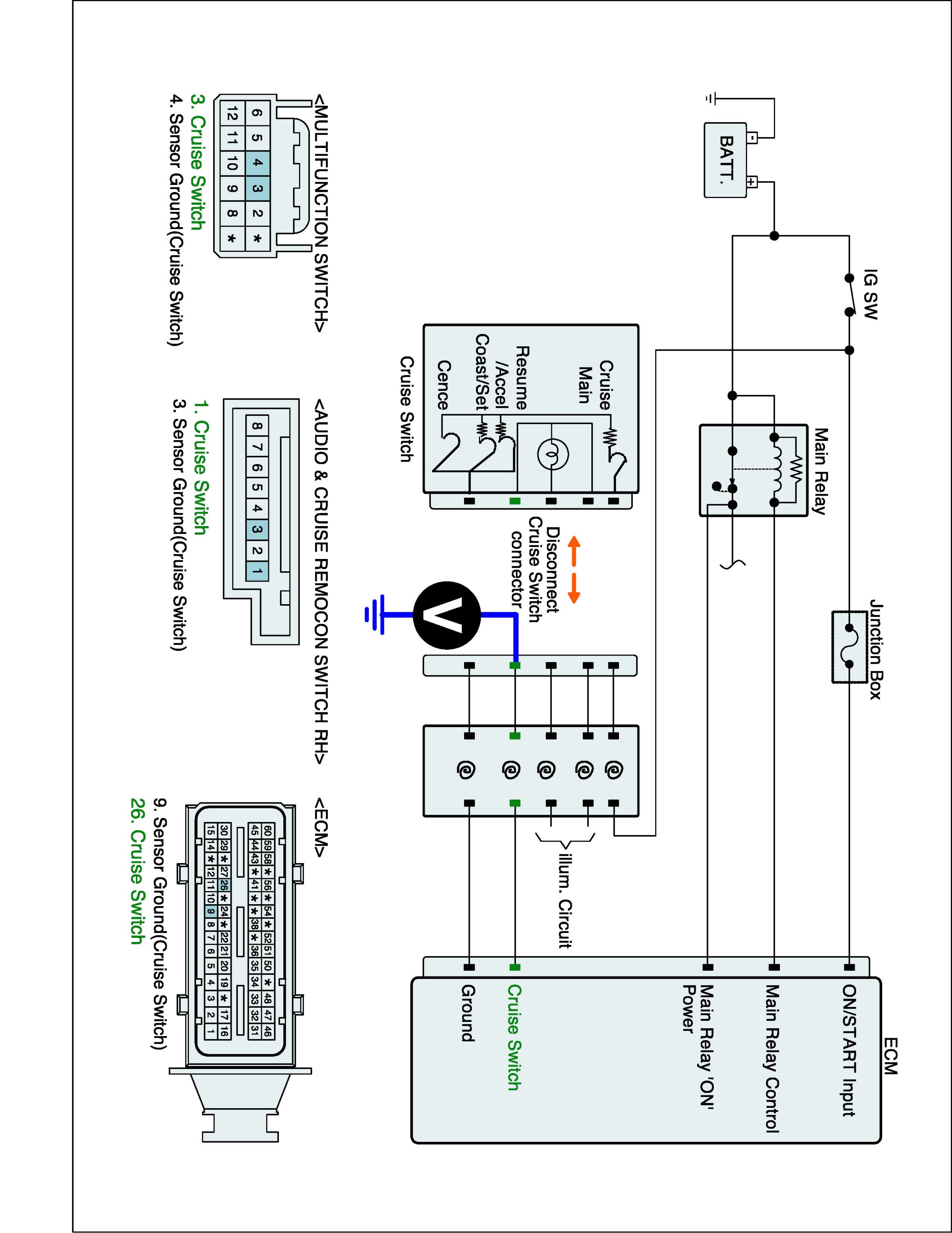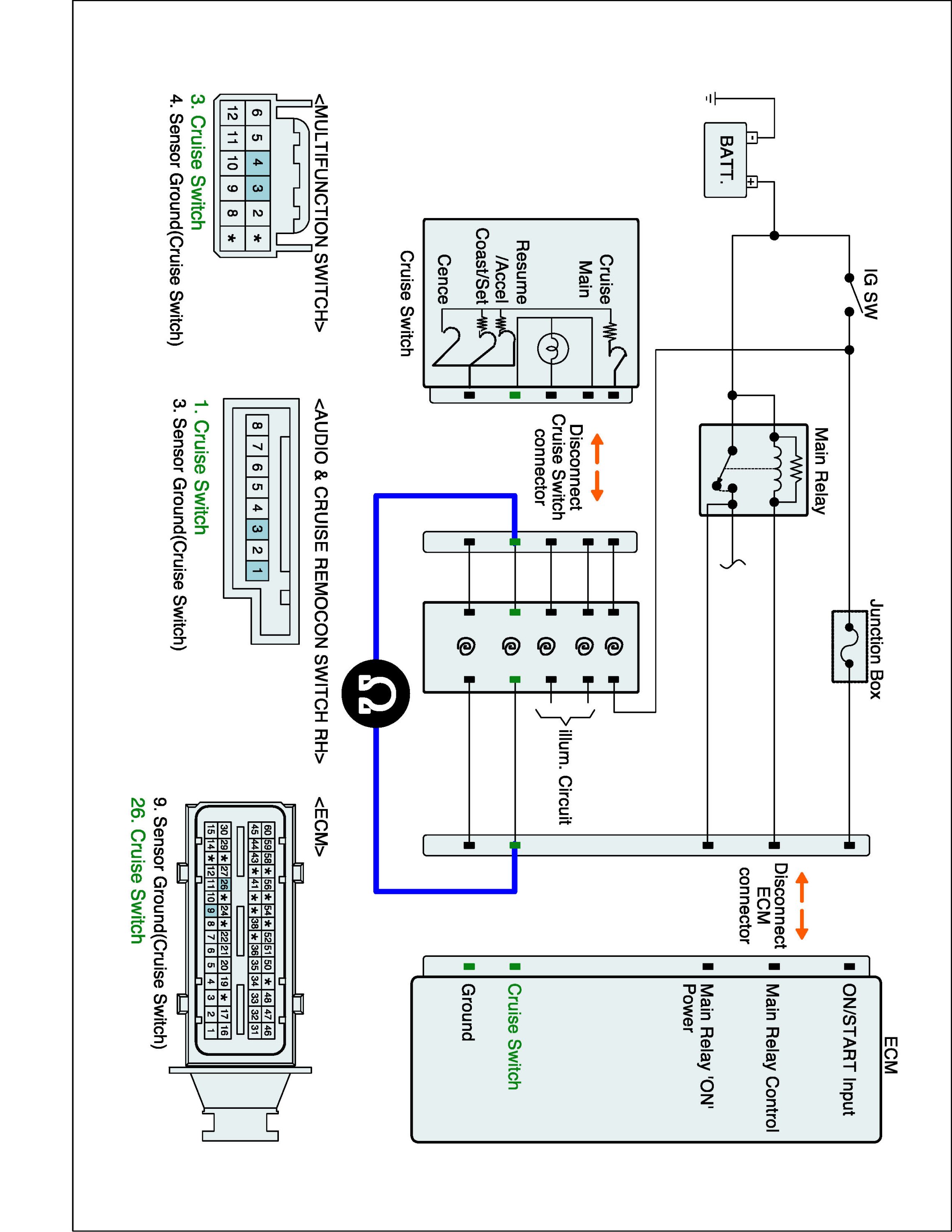 1. IG "OFF" and disconnect Cruise switch connector and ECM connector.