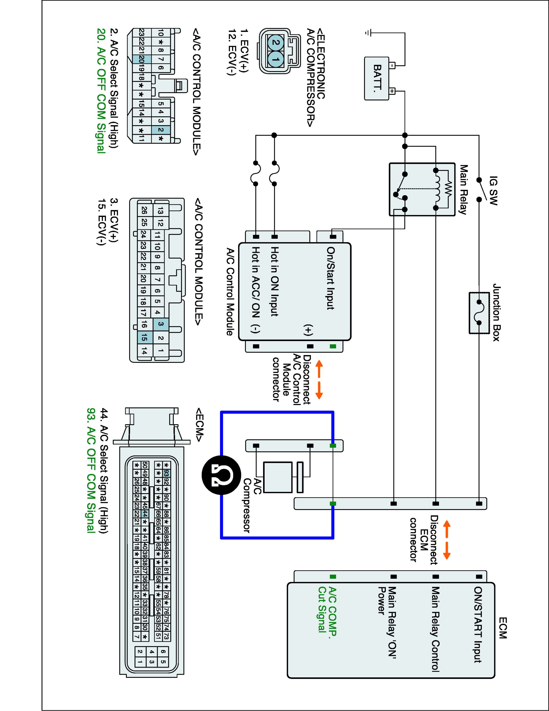 1. IG "OFF" and disconnect A/C Control Module and ECM connector.