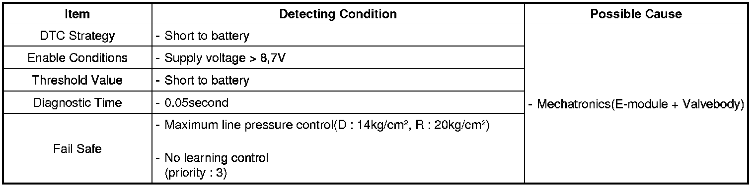 TCM set this code If detected short to battery for solenoid valve circuit. (MIL ON : 2 driving Cycle)