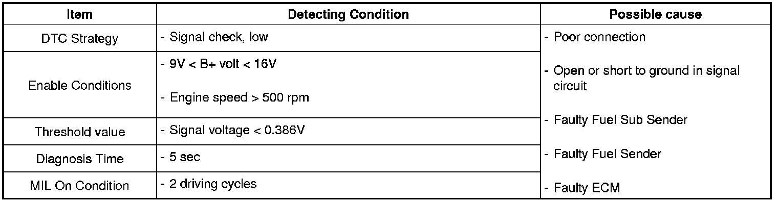 The Fuel Level Sensor (FLS) measures the fuel level in fuel tank and its information is used to supply the ECM with information regarding the monitoring condition of the EVAP canister purge system for leak detection. If the fuel level sensor is monitored for high or low stuck or difference between voltage of fuel level sensor and voltage deviation of fuel level sensor is exceeds limited value while driving, this is interpreted by the ECM as a fault