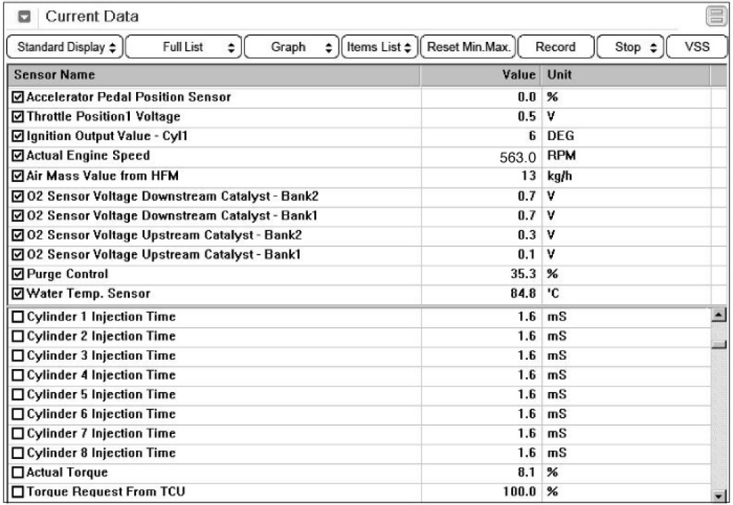 3. Monitor the "Parameters related to air/fuel ratio (HO2S, MAF, TPS, ECTS, PCSV, Injector, etc)" on the scantool.