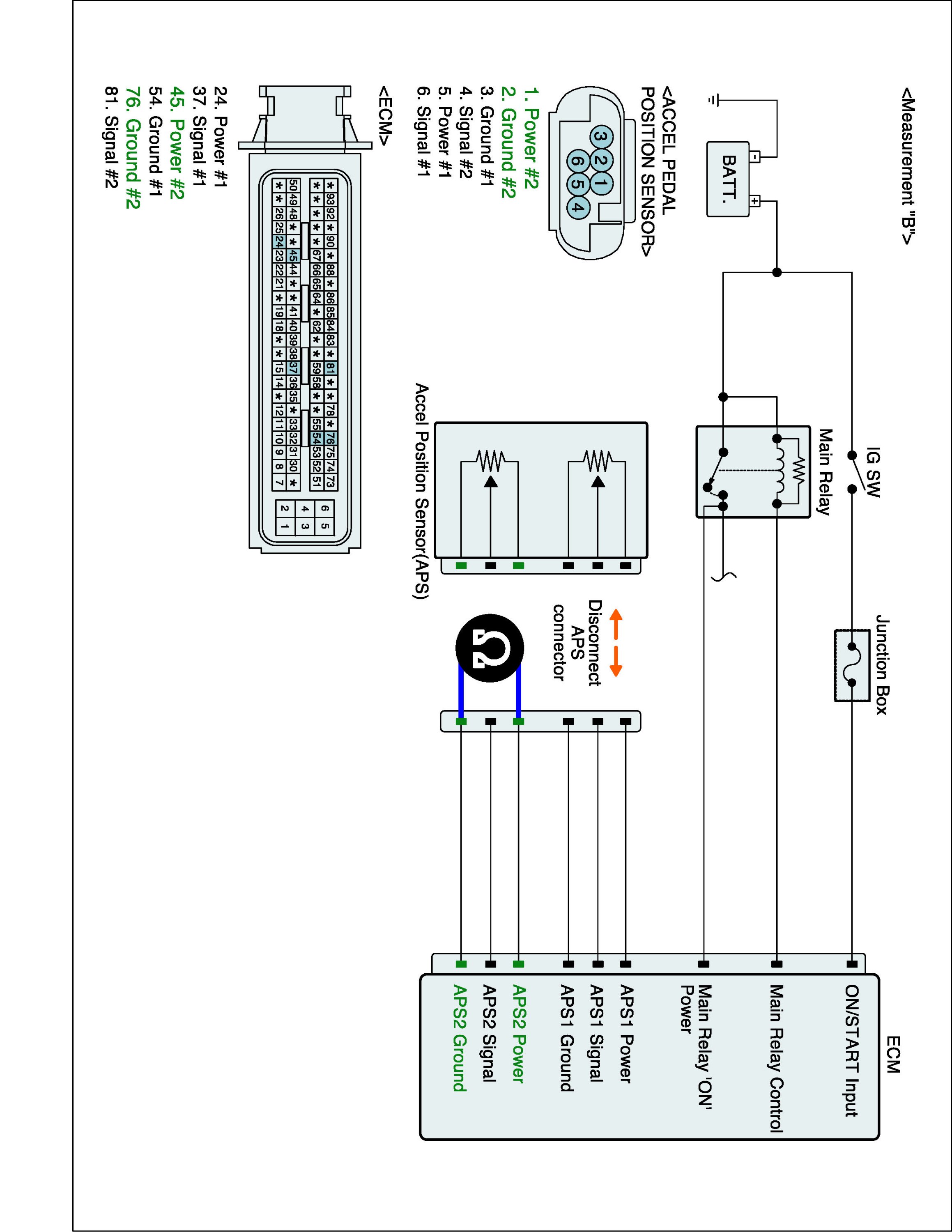 2. Measure resistance between APS2 signal and APS1 power terminals of APS harness connector.