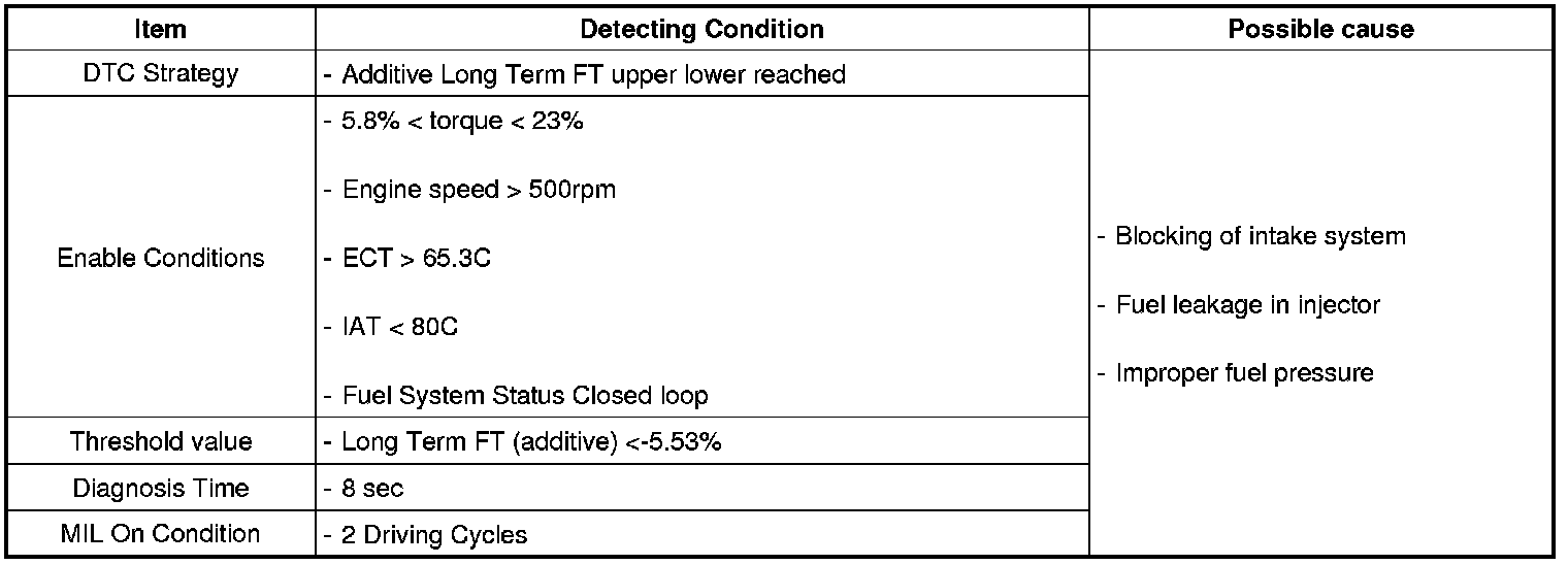 Checking the fuel time value at idle under detecting condition, if its average exceeds the limit over certain period, ECM sets P2190.