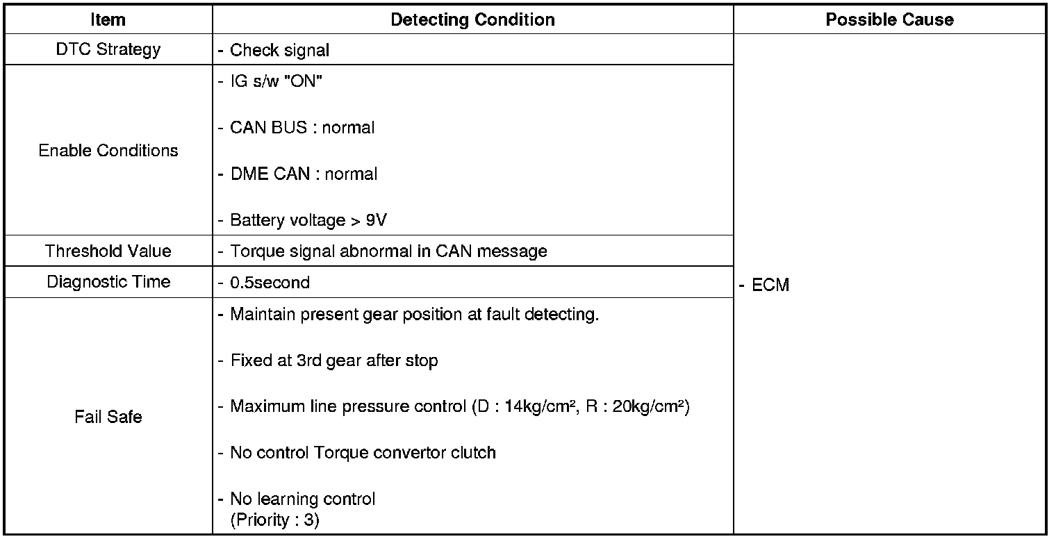 TCM set this code If not match Engine torque signal with TCM torque signal. (MIL ON : 2 driving Cycle)