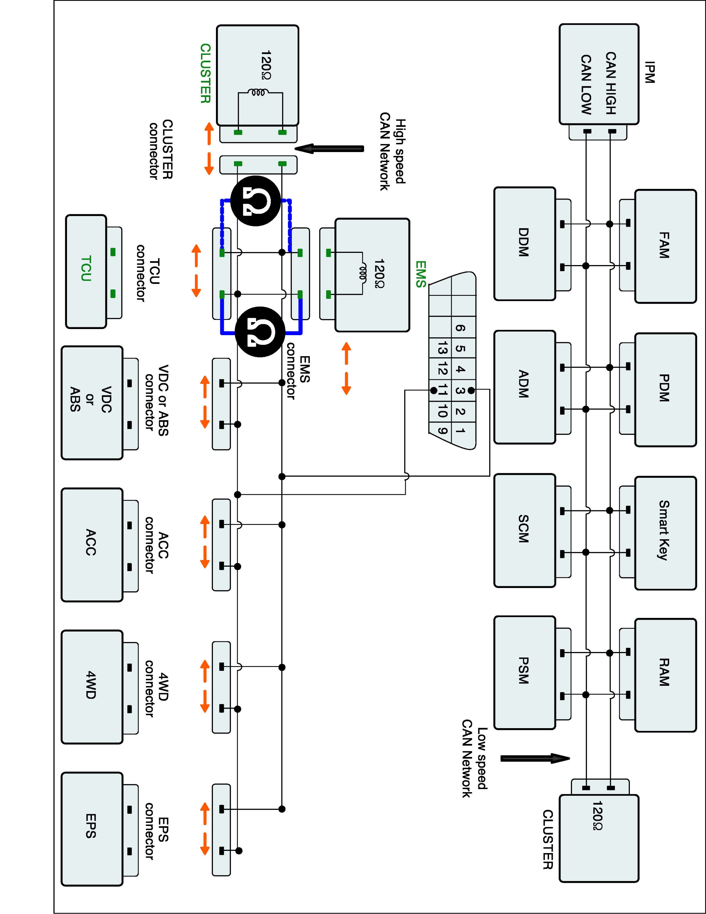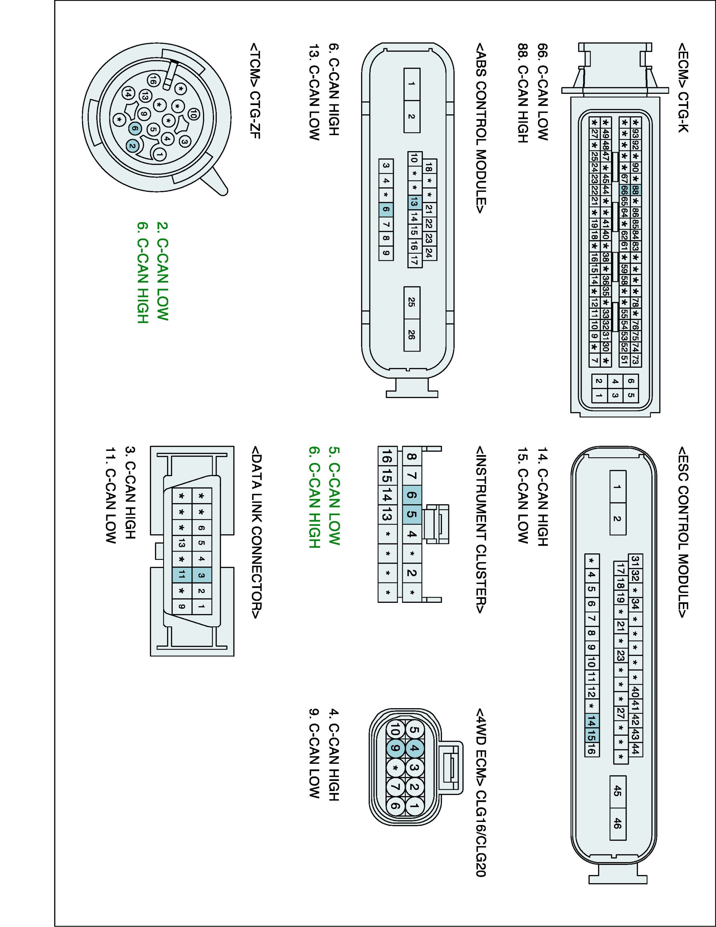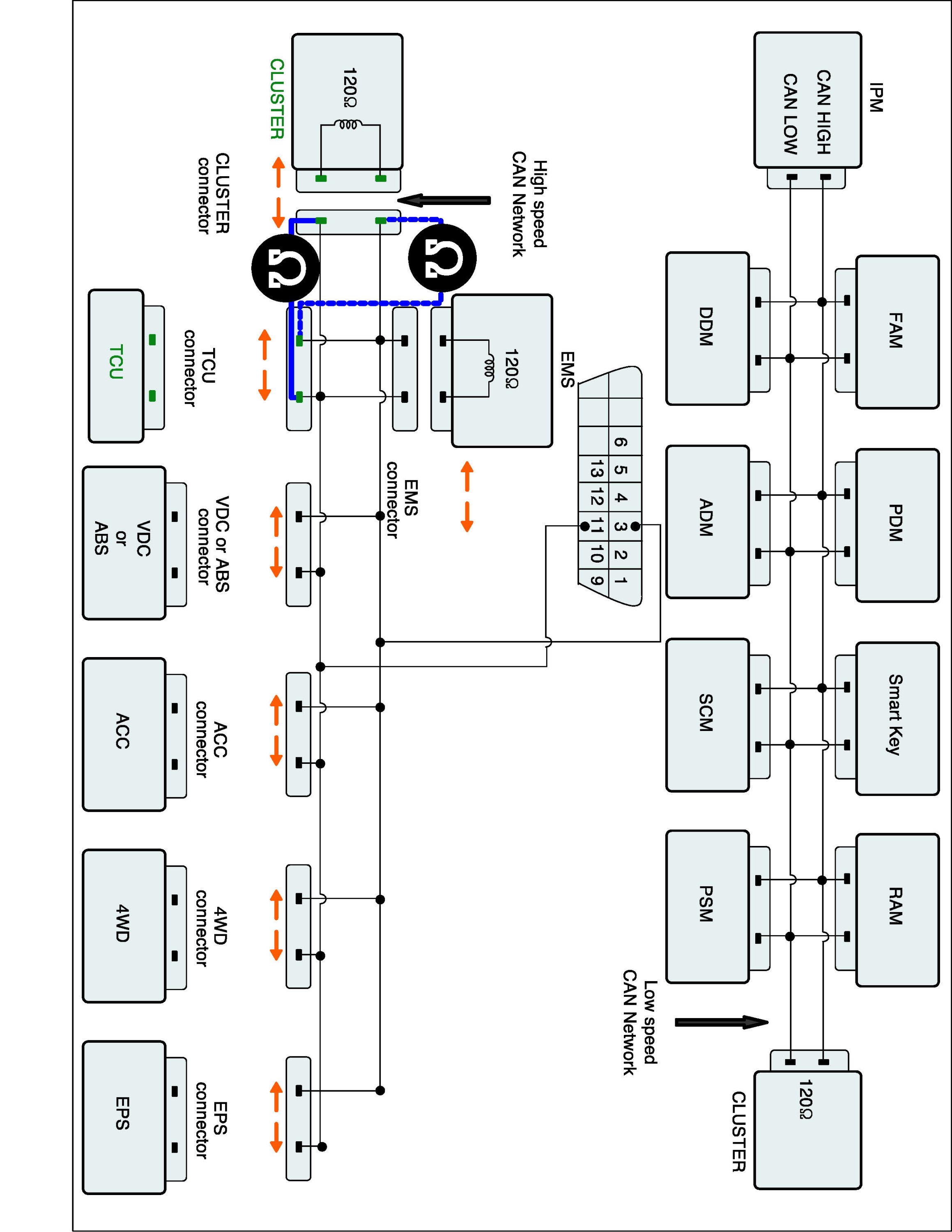 3. Measure resistance between TCM CAN HIGH or CAN LOW and CLUSTER CAN HIGH or CAN LOW terminal.