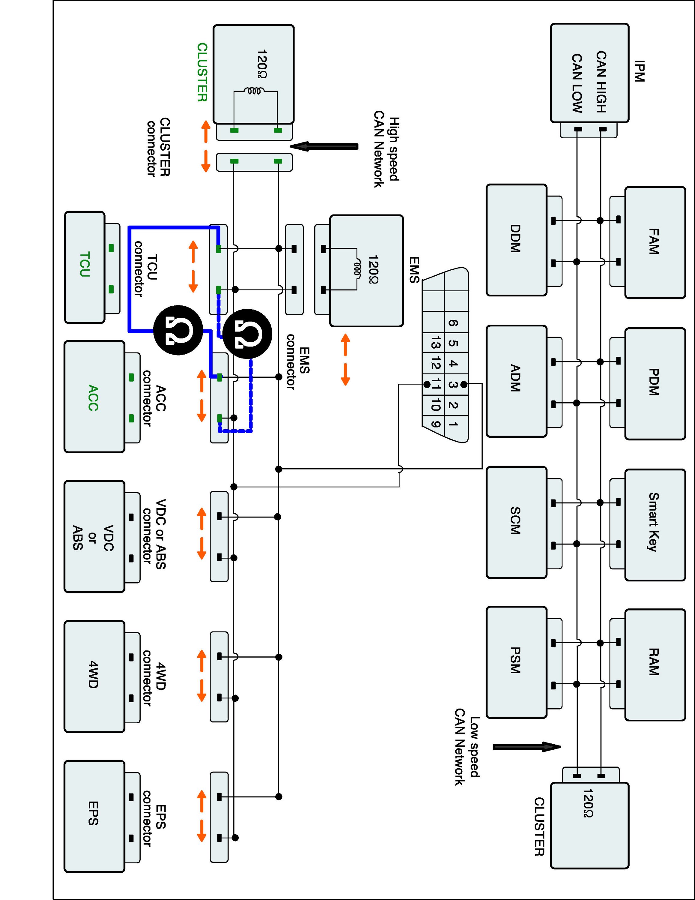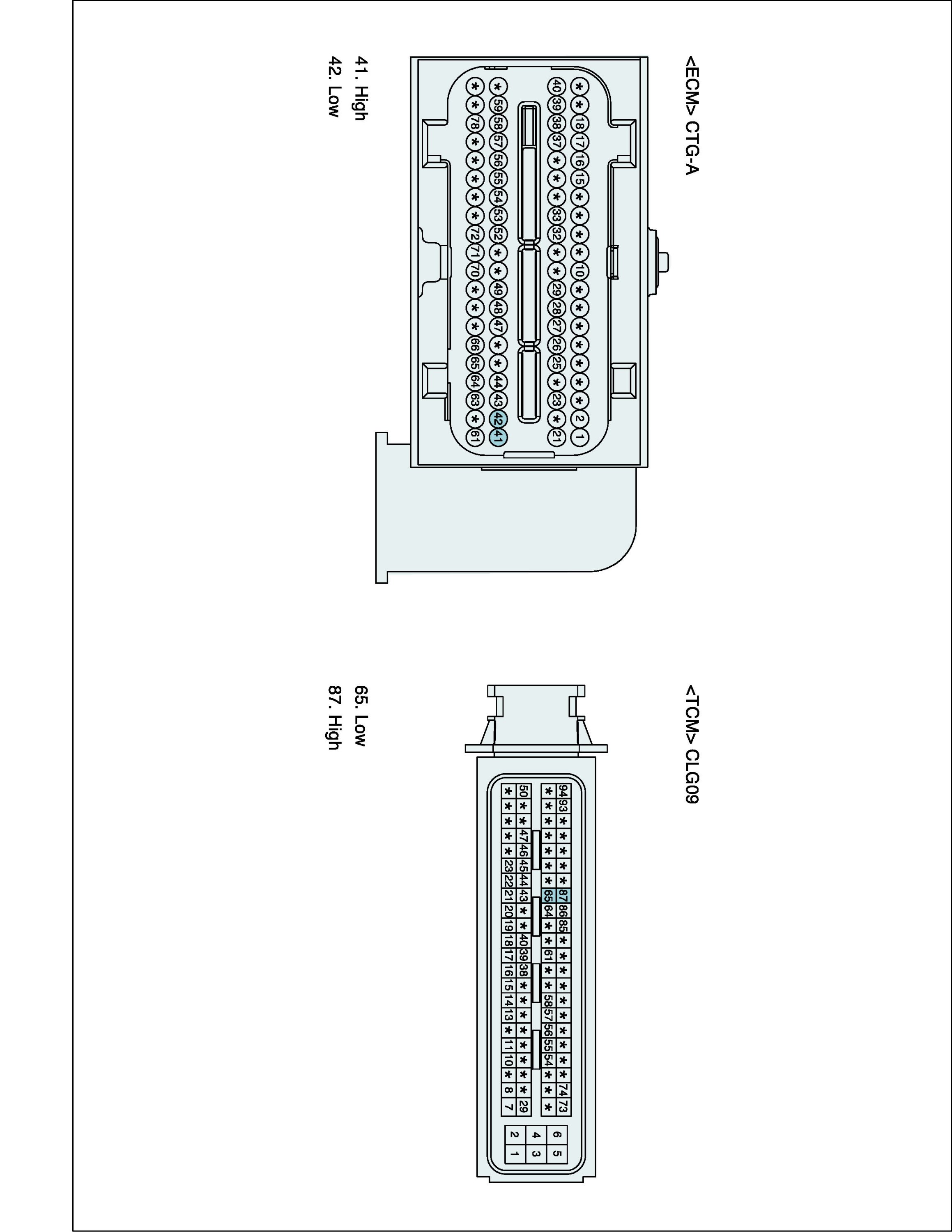 3. Measure resistance between TCM CAN HIGH or CAN LOW and CLUSTER CAN HIGH or CAN LOW terminal.