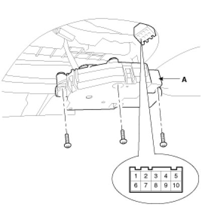 2. Remove the overhead console then remove the sun roof motor mounting screws (3EA). And then remove the sunroof motor (A) after disconnecting the connector (10 Pin).