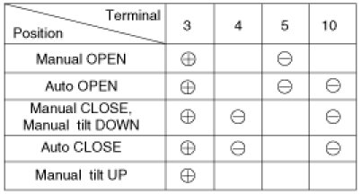 3. Ground the terminals as below table, and check that the sunroof unit operates as below table.