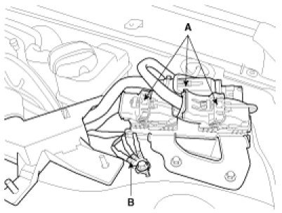 12. Disconnect the ECM, PCM connector (A) and ground (B).