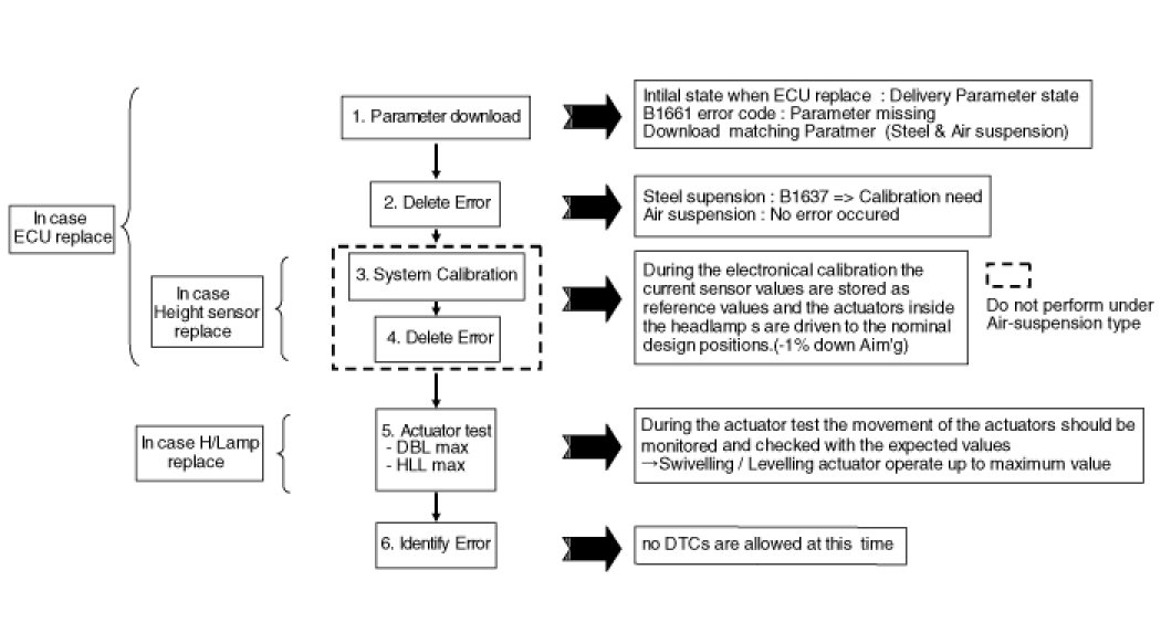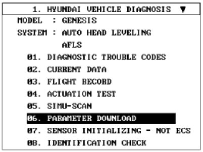When it replace AFLS ECU, H/Lamp Unit, Height sensor, it operates in setting procedure by using Diagnostic equipment following below.