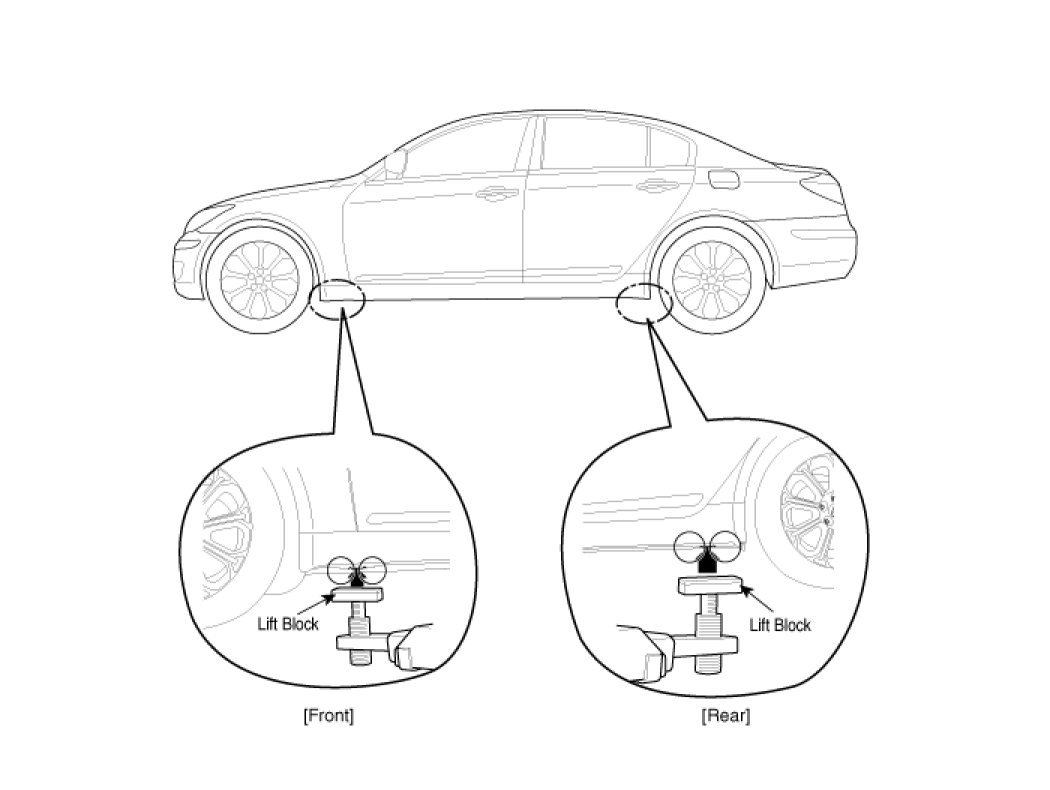 When heavy rear components such as suspension, fuel tank, spare tire, tailgate and trunk lid are to be removed, place additional weight in the luggage area before hoisting. When substantial weight is removed from the rear of the vehicle, the center of gravity may change and can cause the vehicle to tip forward on the hoist.
