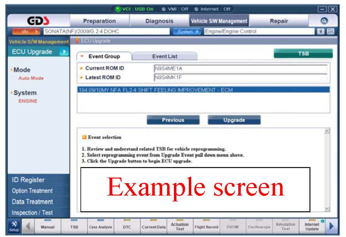 2. Within the ECU Upgrade screen, select ENGINE, Manual Mode, and then select the Upgrade Event: "210. 09~10MY BH 4.6 ECM UPDATE." or any later (higher) event number that shows in the GDS list for any other issue.