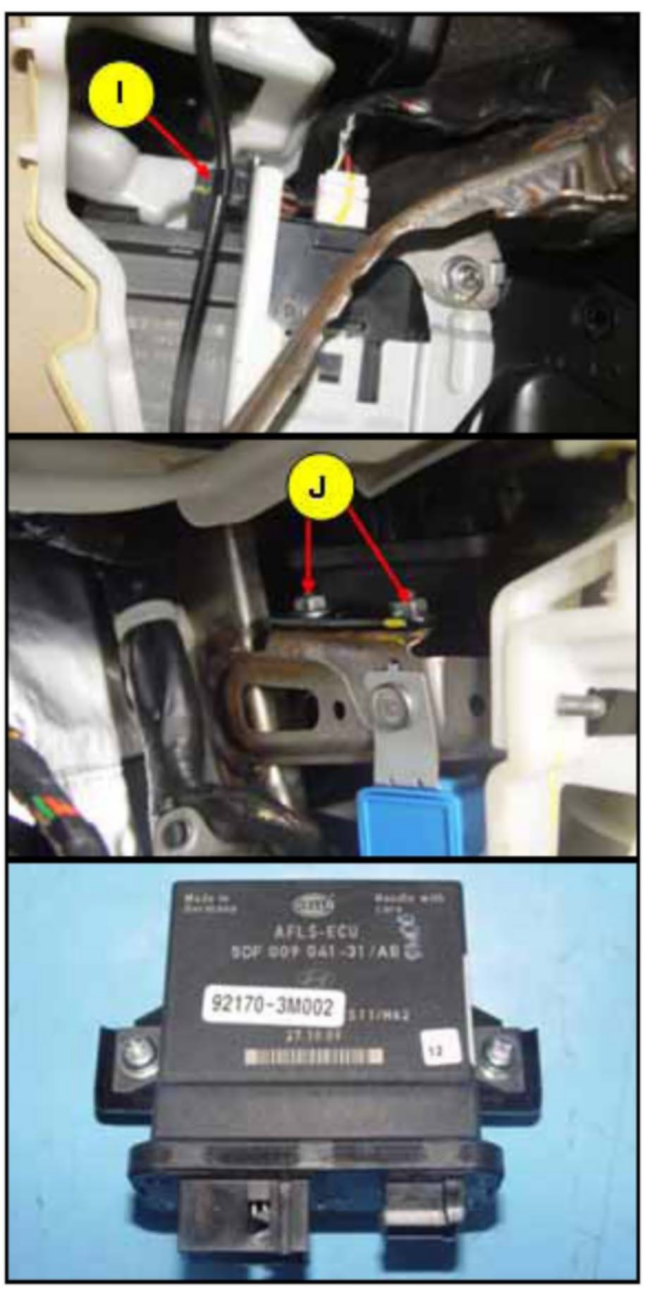 9. Remove the 2 AFLS ECU mounting nuts (J) behind the right top of the audio assembly and remove the AFLS ECU.