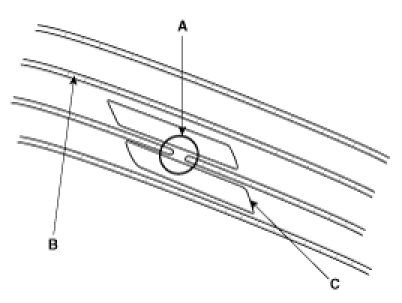 2. Carefully mask above and below the broken portion of the glass antenna wire (B) with cellophane tape (C).