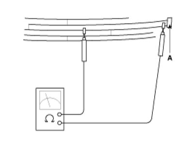 2. Touch one tester probe to the glass antenna terminal (A) hear, and move the other tester probe along the antenna wires to check that continuity exists.