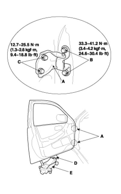 After installing the door, check for a flush fit with the Body, then check for equal gaps between the front, rear, and bottom, door edges and the body. Check that the door and body edges are parallel. before adjusting, replace the mounting bolts.