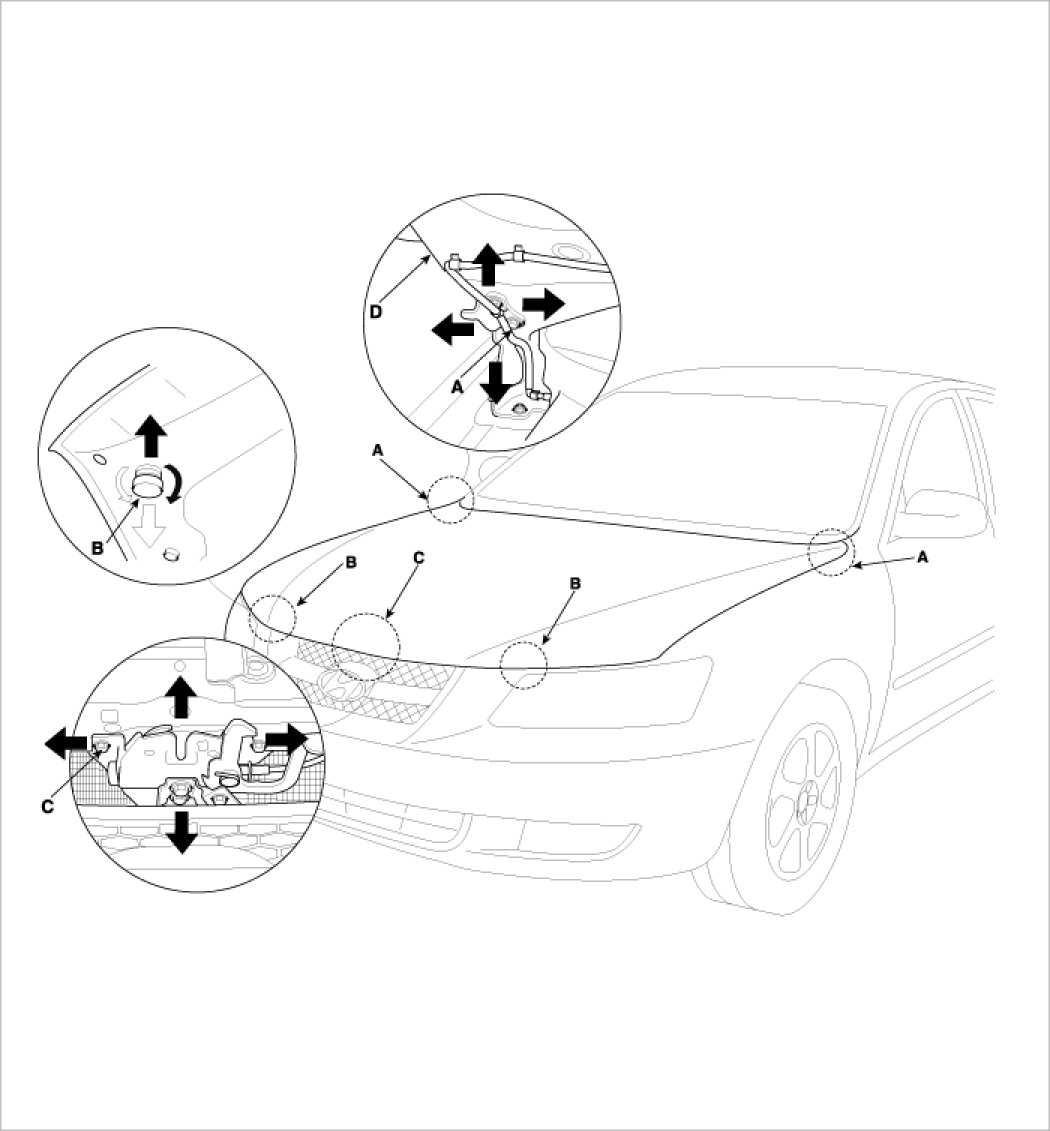 3. After loosening the hood latch (C) mounting bolts, adjust the latch by moving it up or down, or right or left.
