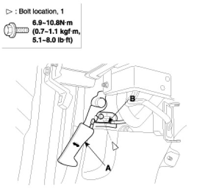 1. Remove the mounting bolt, then remove the hood release handle (A).