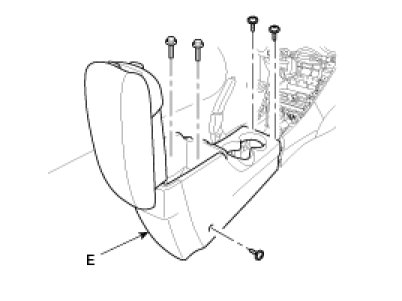 6. After loosening the console mounting screws, then remove the floor console assembly (E).