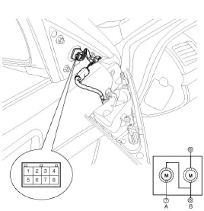 3. Apply battery voltage to each terminal as shown in the table and verify that the mirror operates properly.