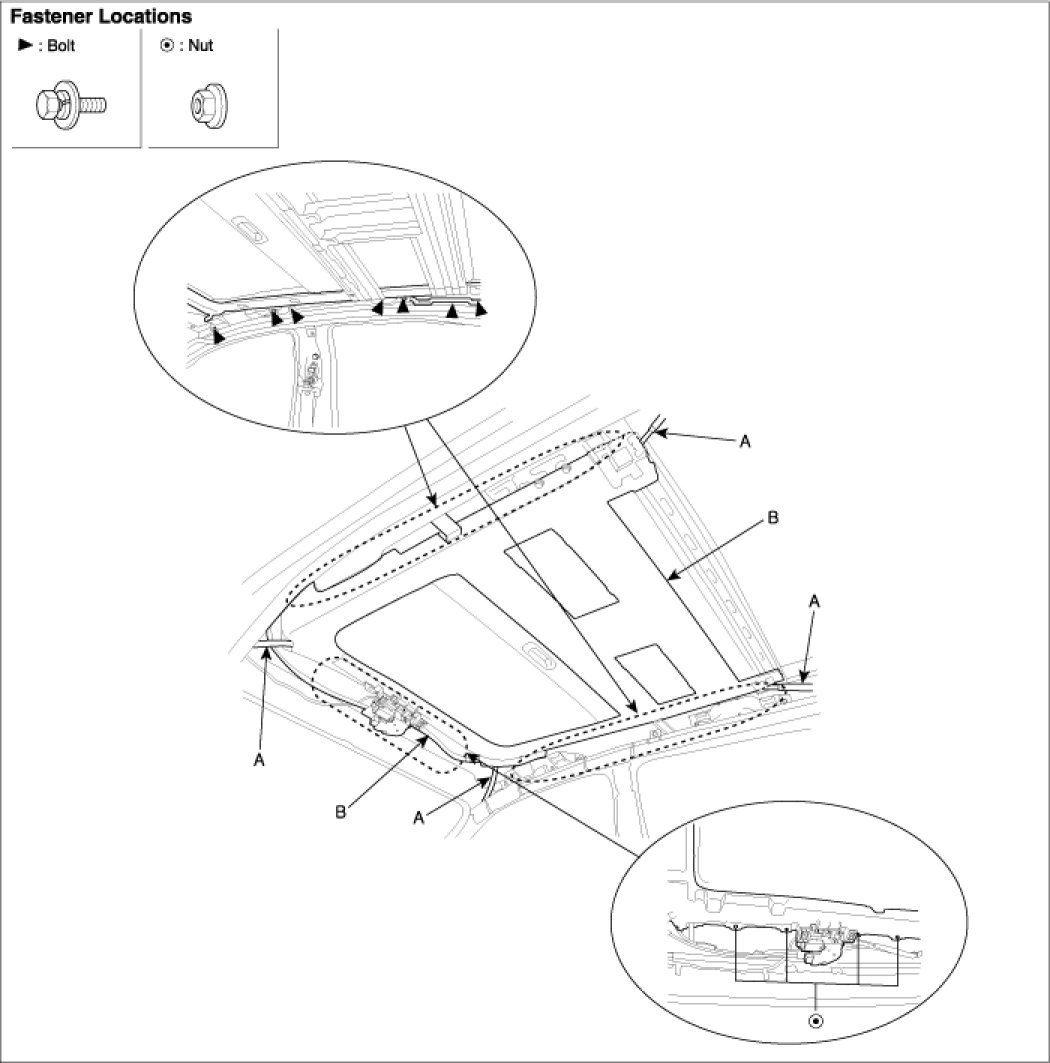 3. After loosening the mounding bolts and nuts, remove the sunroof assembly (B).