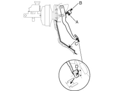 2. If the pedal free play is out of specification, adjust the brake switch (C). If the pedal free play is insufficient, it may result in brake drag.