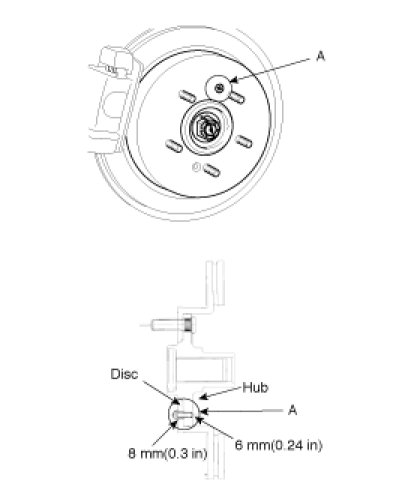 1. Remove the brake disc from hub using an M8 screw(A) if the brake disc has been seized with the hub due to corrosion or overheating.