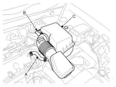 11. Install the air cleaner assembly (C) then connect the breather hose (A), ECM connector (B).