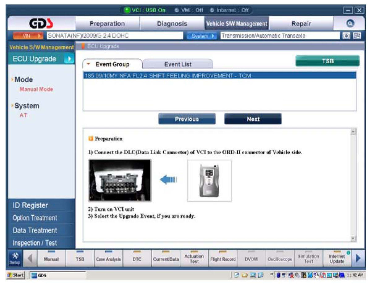 5. Select update event 185 O9IIOMY NFA FL2.4 Shift Feeling Improvement - TCM or any later (higher) event number that shows in the GDS list. Select Upgrade.