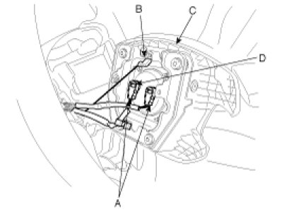 3. Disconnect the connectors(A) after lifting up the pin (D) and the horn connector(B). Remove the driver's airbag(C) from the steering wheel.