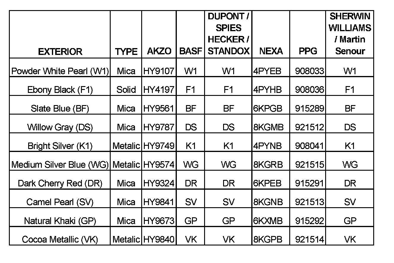 This TSB provides information on 2009 model year exterior colors used on the Sonata. It includes Hyundai paint codes and several paint manufacturers' formula codes.